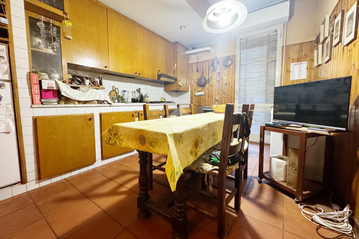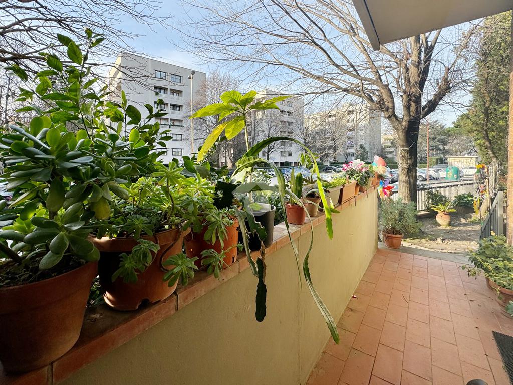 L’ingresso conduce direttamente in una zona giorno molto ampia e luminosa, dotata di porta finestra con accesso al balcone collegato al giardino. La cucina è abitabile, separata e con uscita su un ulteriore balcone, anch’esso affacciato sullo spazio esterno, garantendo funzionalità e continuità tra interno ed esterno.